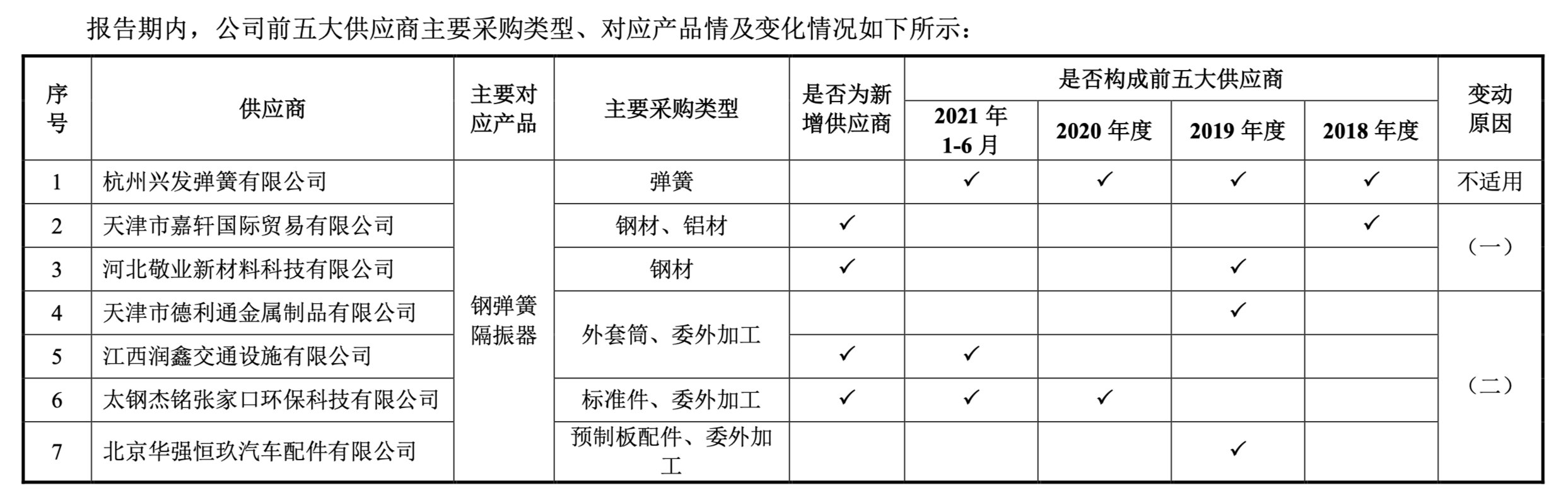 截至目前,九州一轨弹簧供应商较为稳固,但由于原材料采购、委外加工规模增长,以及技术工艺与项目需求变更等因素,整体来看报告期内公司前五大供应商变动较大。