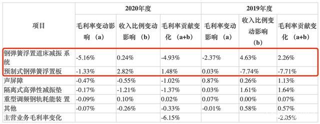 进一步来看,九州一轨2018年-2020年销售毛利率分别为51.38%、49.34%和43.16%,2019年度较2018年度下降2.05个百分点,2020年度较2019年下降6.15个百分点。对此,九州一轨在招股书中解释道,“2019年度主营业务毛利率下降主要因钢弹簧浮置道床减振系统毛利率下降、预制式钢弹簧浮置板收入占比下降双重因素引起;2020年度主营业务毛利率下降主要因钢弹簧浮置道床减振系统毛利率下降、预制式钢弹簧浮置板产品毛利率下降引起。”?